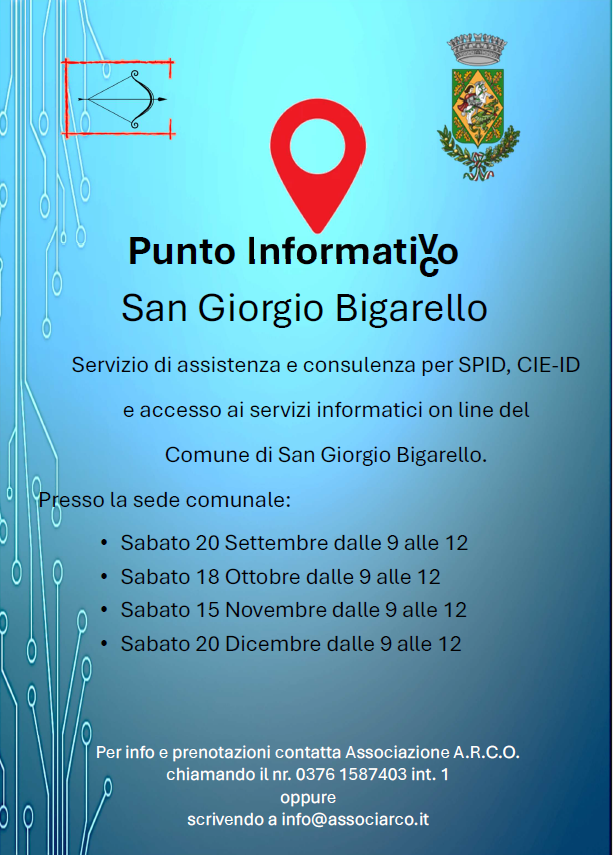 Il Comune di San Giorgio Bigarello e l'Associazione A.R.C.O., in continuità con il progetto di digitalizzazione dei servizi erogati e di supporto alla popolazione per l'accesso agli stessi, organizzano quattro giornate in cui i volontari dell'associazione saranno disponibili presso l'Ufficio Relazioni con il Pubblico - URP per fornire assistenza e consulenza ai cittadini in tema di identità digitale (SPID e CIE-ID).